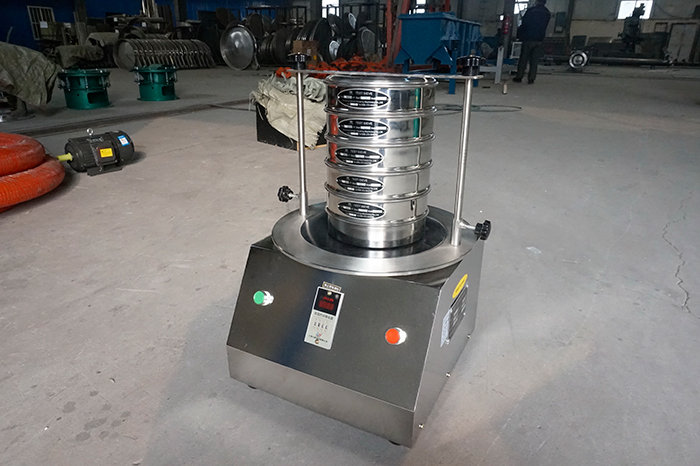 試驗(yàn)篩機(jī)是以YZU立式振動(dòng)電機(jī)作為整機(jī)振動(dòng)源,通過振動(dòng)電機(jī)帶動(dòng)上部振動(dòng)盤振動(dòng),再通過振動(dòng)盤傳導(dǎo)至安放在振動(dòng)盤上部Φ200篩框上,然后由需要檢測(cè)目數(shù)的篩框把小于篩網(wǎng)孔徑的物料顆粒篩分至下層篩框,如此層層篩選,使每層試驗(yàn)篩內(nèi)只留相同粒度的物料,達(dá)到不同粒度的分離并確定此物料的粒度組成,使Φ200型篩框中的物料能非常有效的起到過濾、分級(jí)、篩分目的。